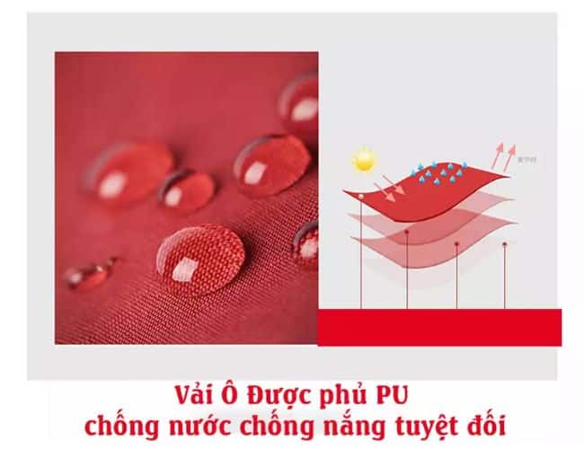 Được sử dụng là chất liệu vải dù polyester (PU hoặc PE), có khả năng chống thấm nước, chống nắn, bền và chống chịu thời tiết để làm vải mái (áo) của ô.